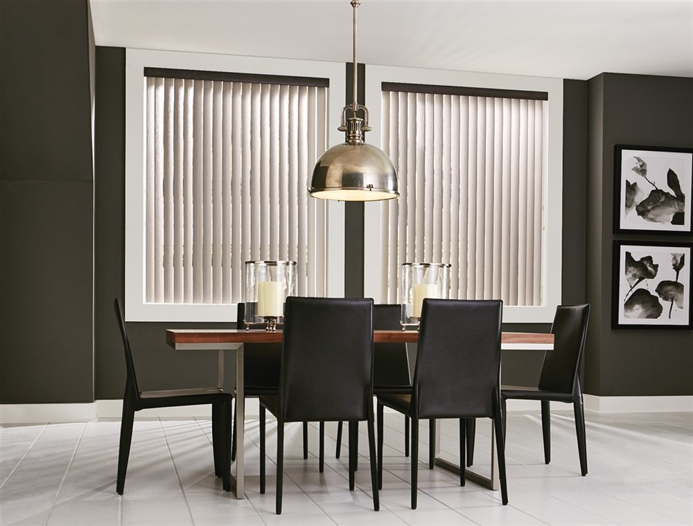 Traditional vinyl vertical blinds combine linear beauty with functional charm for long-lasting appeal. Available in either crown or S-shaped louver styles to create just the right look.